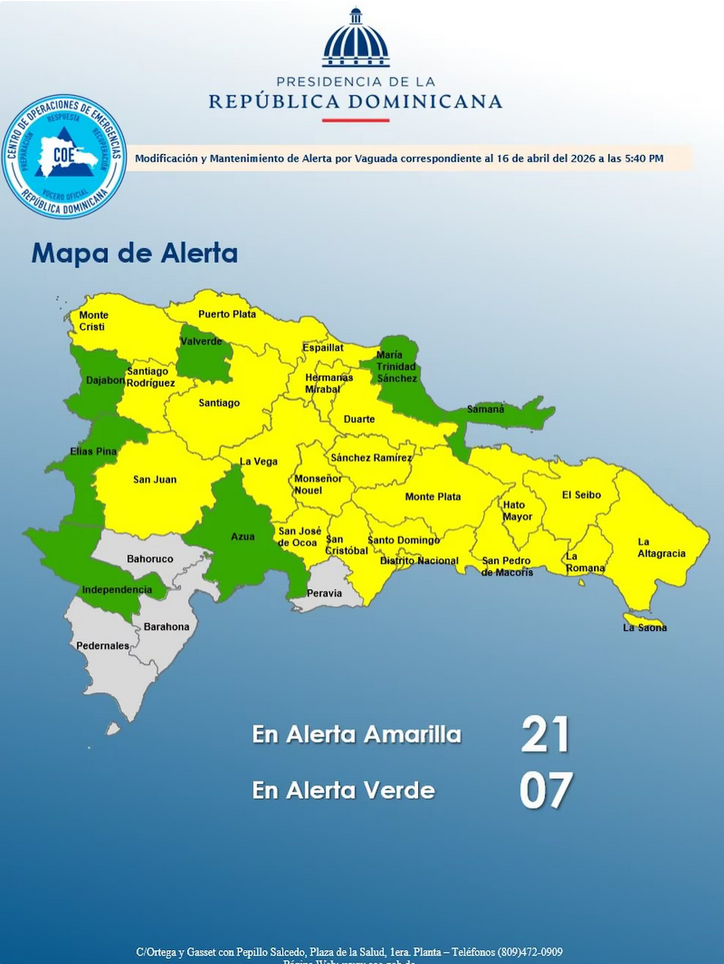 Las provincias actualmente en alerta amarilla son: Santo Domingo, San José de Ocoa, Distrito Nacional, Santiago Rodríguez, San Pedro de Macorís, Monte Cristi, Hermanas Mirabal, Santiago, Puerto Plata, Monseñor Nouel, La Altagracia, San Cristóbal, Monte Plata, La Romana, Duarte (el Bajo Yuna), El Seibo, Hato Mayor, La Vega, Sánchez Ramírez, Espaillat y San Juan. En alerta verde permanecen: María Trinidad Sánchez, Valverde, Independencia, Samaná, Dajabón, Elías Piña y Azúa.
